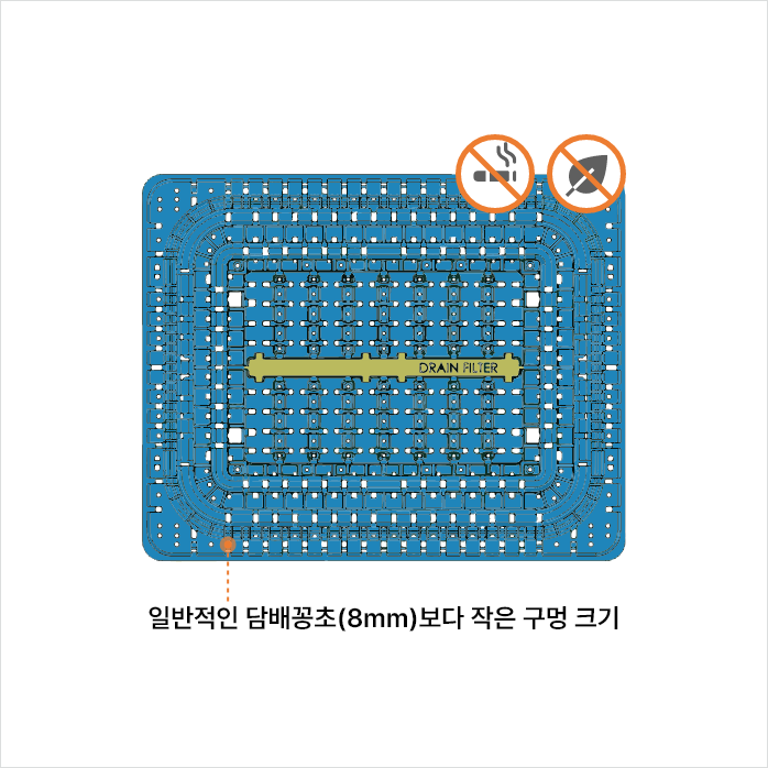 쓰레기나 낙엽이 몰려와도 구멍과 구멍 좌우 벽의 단차가 존재하도록 설계하여 물은 빠지고 이물질은 벽에 막혀 걸러집니다.