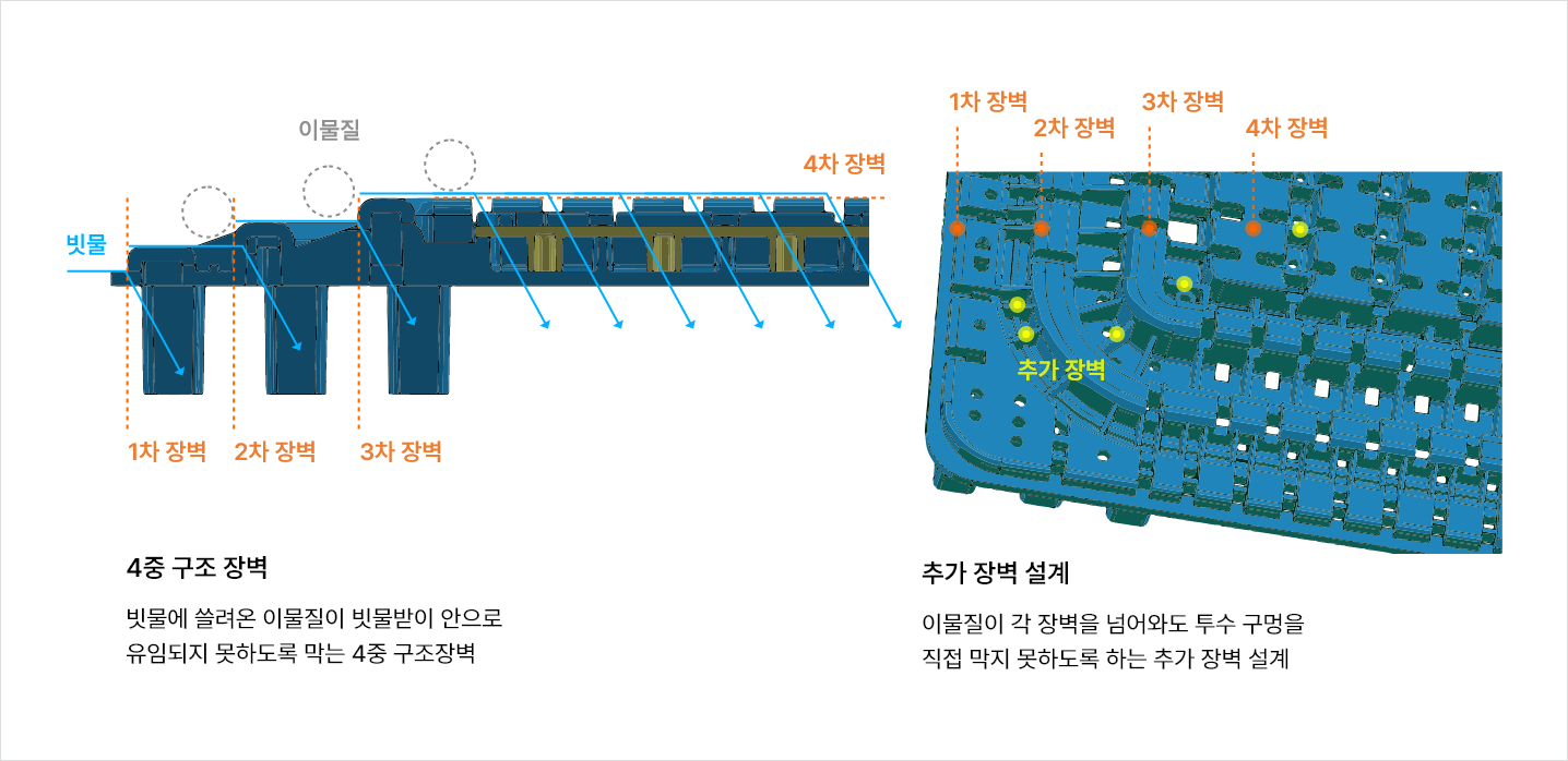 또한, 각 장벽을 넘어선 이물질도 직접적으로 투수 구멍을 막지 못하도록 이물질을 띄우는 추가 장벽까지 더해 폭우의 상황에서도 구멍이 막히지 않도록 설계하였습니다.