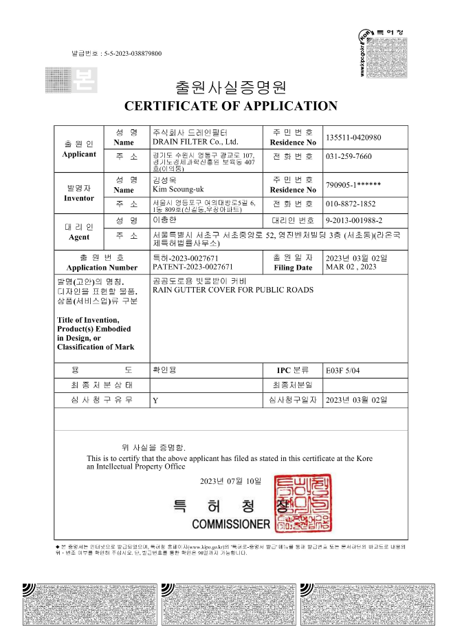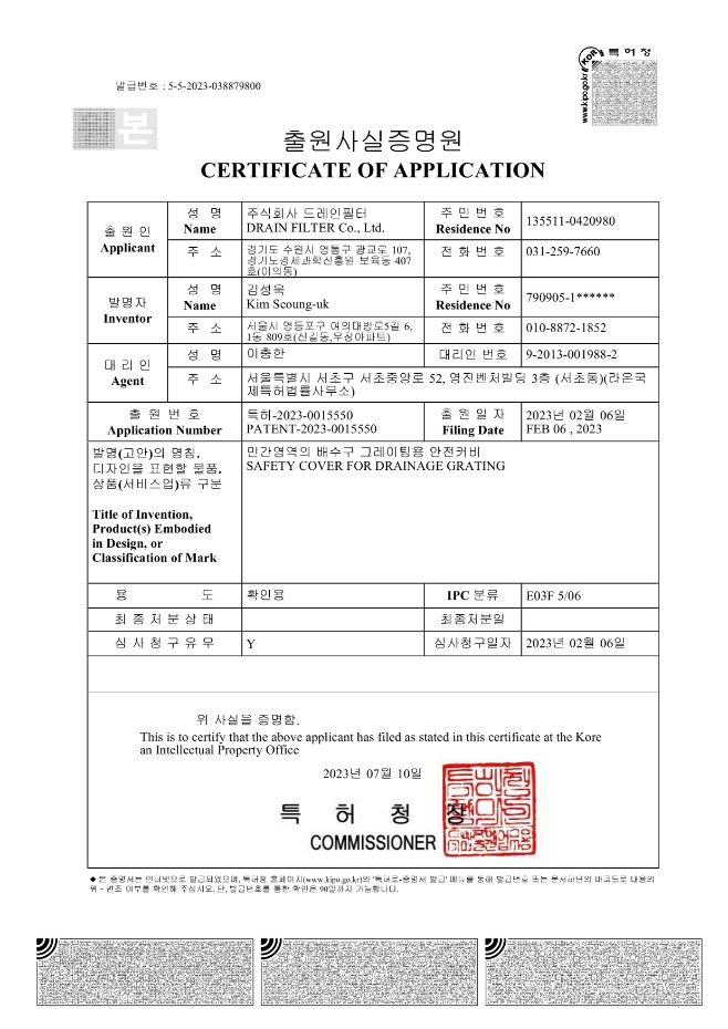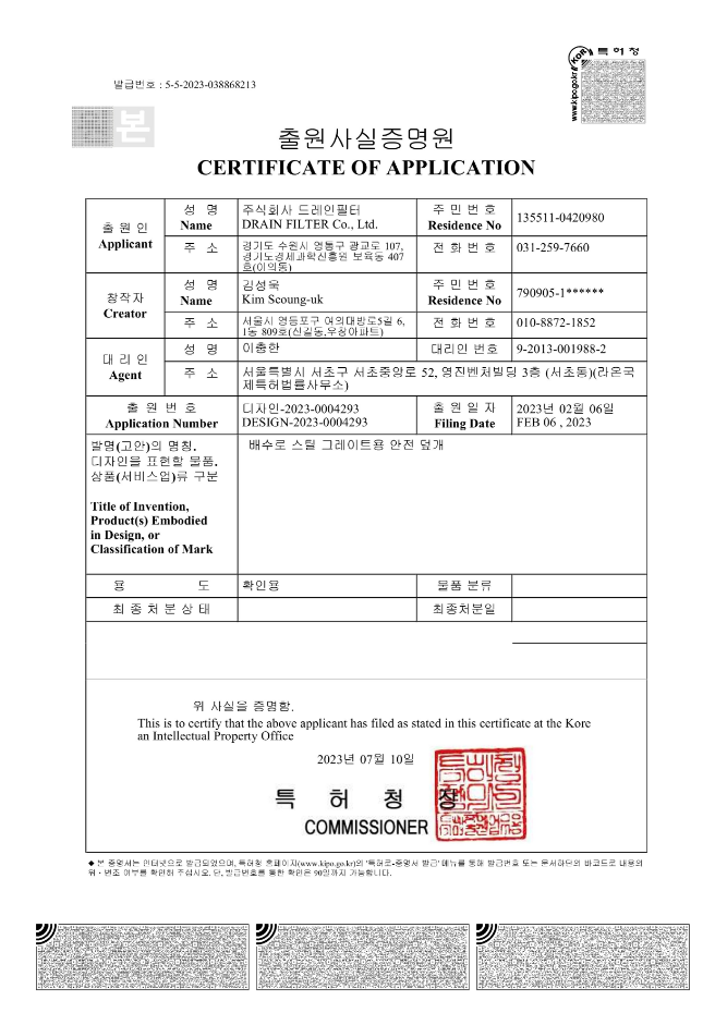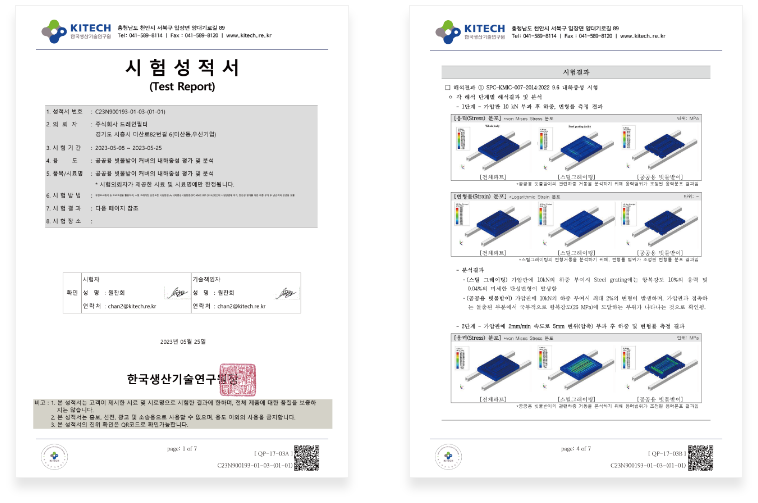 한국생산기술연구원의 내하중 시험에서 빗물받이 스틸 그레이팅의 변형이 일어날때까지 그레이팅 필터는 파손되지 않는 것으로 나타나 뛰어난 내구성이 증명되었습니다. (60kN 이상에서 스틸그레이팅이 변형) 또한, 불에 잘 타지 않는 난연 소재로 되어 있어 담배꽁초 등이 떨어져도 불이나거나 녹지 않습니다.