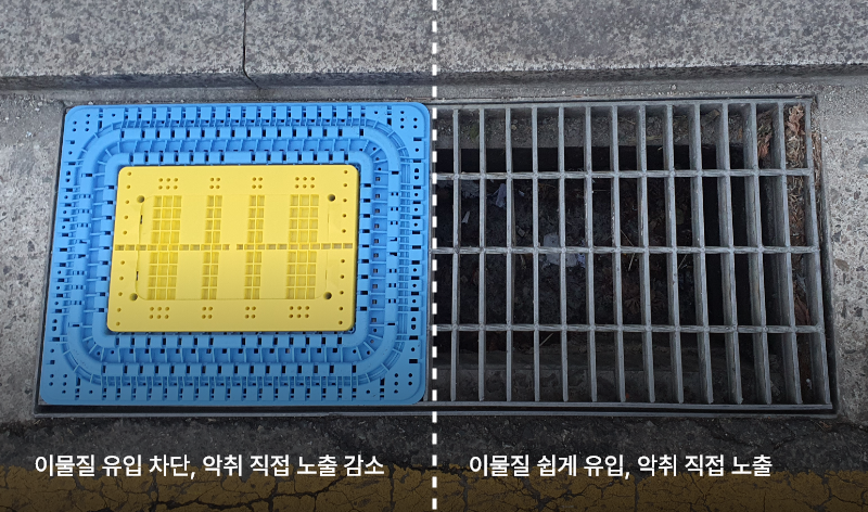 악취는 빗물받이 내부로 유기물이 유입되어 썩기 때문에 발생하는데, 그레이팅 필터는 이러한 이물질의 유입을 차단하면서 빗물받이 내부 공기가 외부로 광범위하게 새어나가는 것을 차단하기 때문에 악취를 감소시켜줍니다.