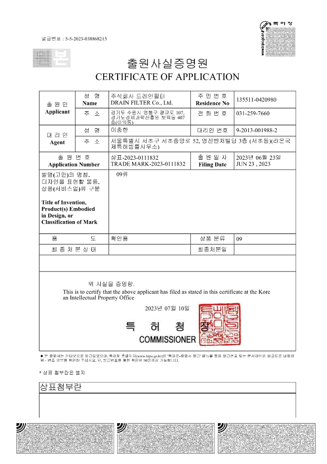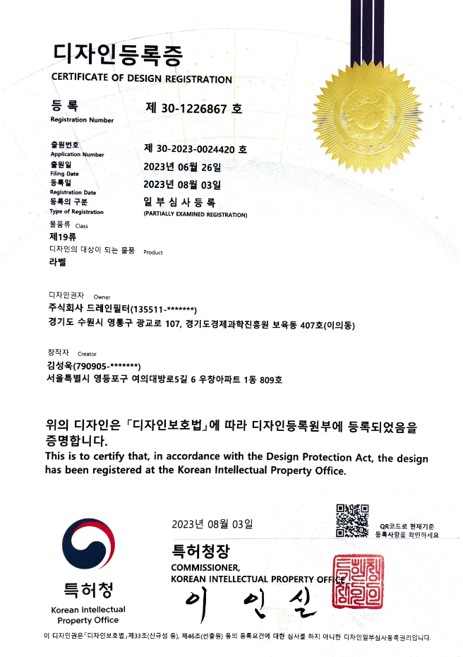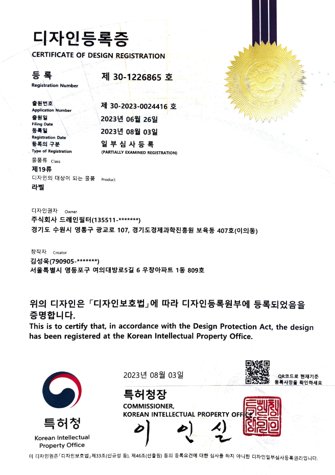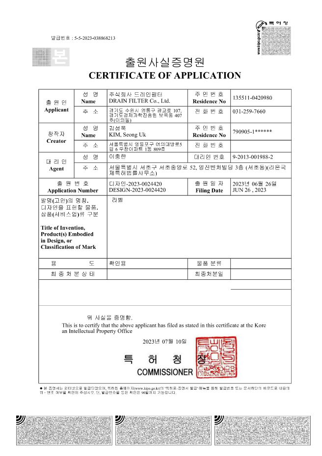 그레이팅 필터 제품 관련 특허 2건, 디자인 5건,
