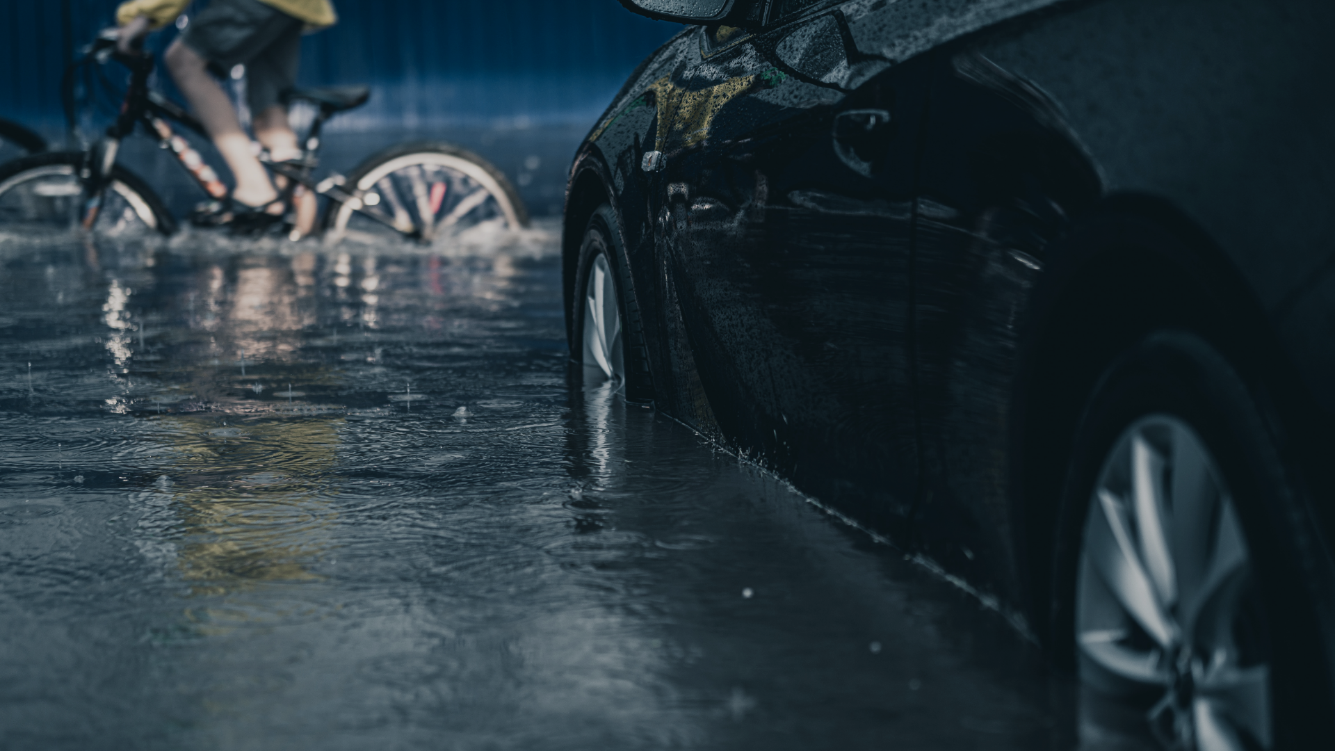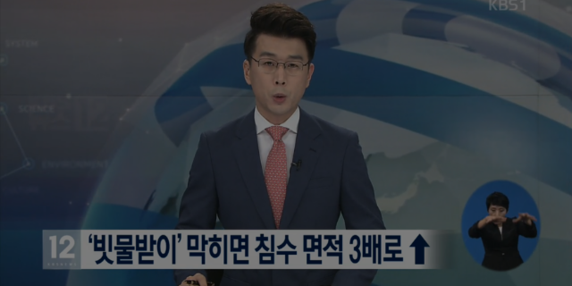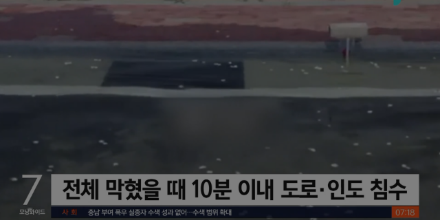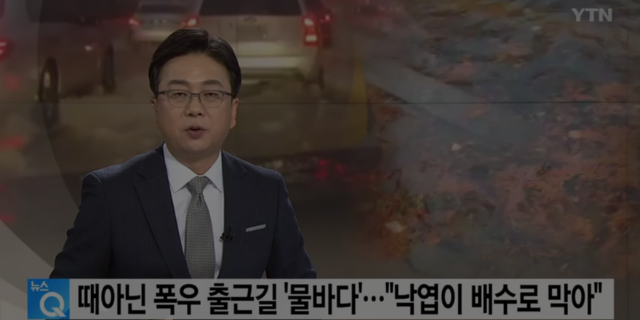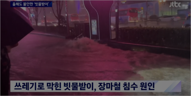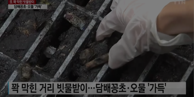 이물질이 빗물받이 안으로 빨려들어가 배수구가 막혀서 물이 역류합니다.